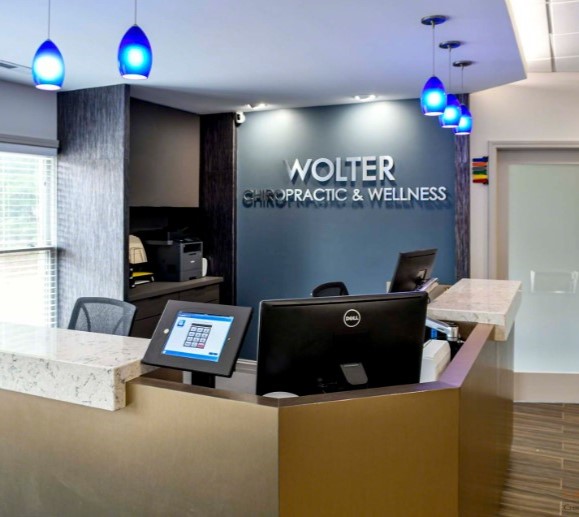 The first point of impact, since the space was located immediately opposite the elevators, a modern solid glass wall and door were used to create openness and a WOW visibility to others that frequent the building. Desiring the natural light from the exterior windows to flow through the space, CrossFields created a large open space with track accent lighting divided only by and dramatic partial height accent wall to divide the inviting waiting, retail and front desk area from the inviting pre-adjusting hospitality and adjusting area, all accented with modern track lighting. To vary the atmosphere with the functions of the space, a lower ceiling and soft finishes and reduced light level created a serene massage, therapy exam and Report of Findings area.