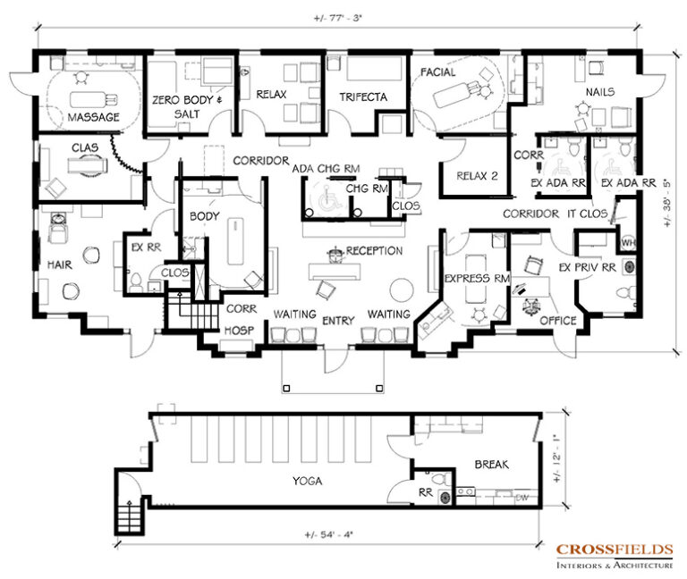 - Upper Level Functions: Yoga, staff breakroom spaces separated from guest areas to maintain quiet, professional environment and staff efficiency.